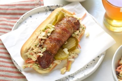 Maple Bourbon Mustard Glazed Bacon Wrapped Bratwurst